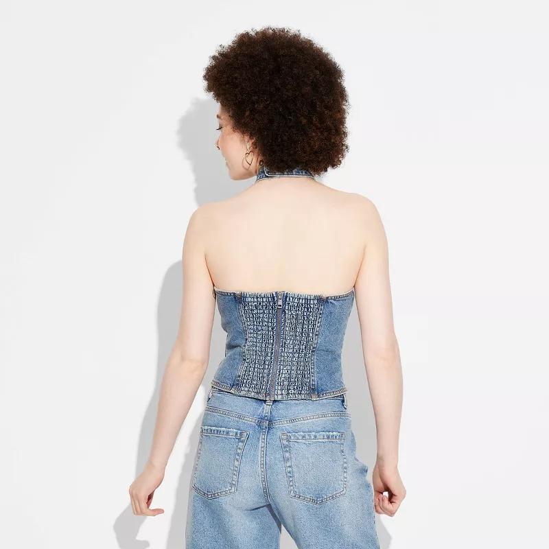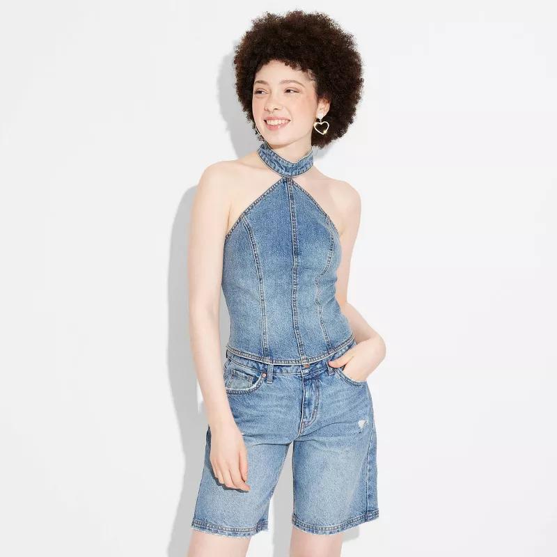 Rosette denim tank from Wild Fable™ tailored in a slim fit with a cropped length. Features a halter neck with behind-the-neck snap buttons. Made of midweight cotton with a hint of spandex for comfortable wear that moves with you. Smocked back and zipper fastening complete the look and allow for easy on and off.