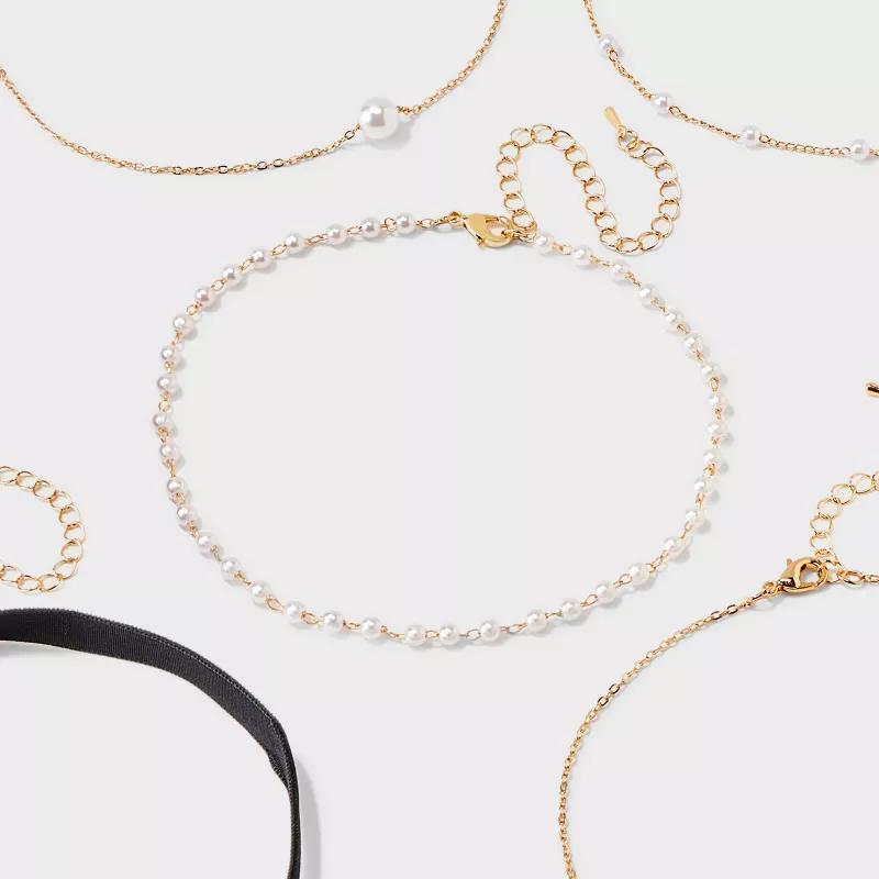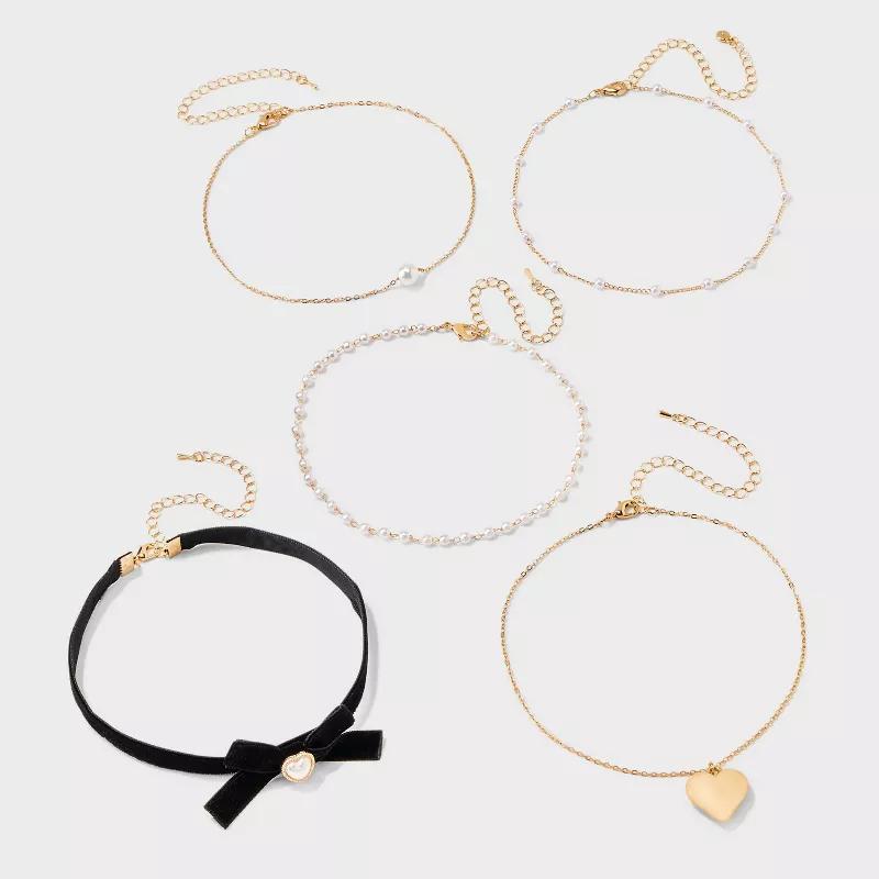 Five-piece choker necklace set from Wild Fable™ in gold tones. Includes one black fabric necklace embellished with a bow and heart charm plus four dainty chain necklaces featuring various designs. Chains include one adorned with a gold-finish heart, another with a white faux-pearl charm, and two embellished with white faux pearls interspersed among chain links. Four-inch extender chains help you find the perfect fit.