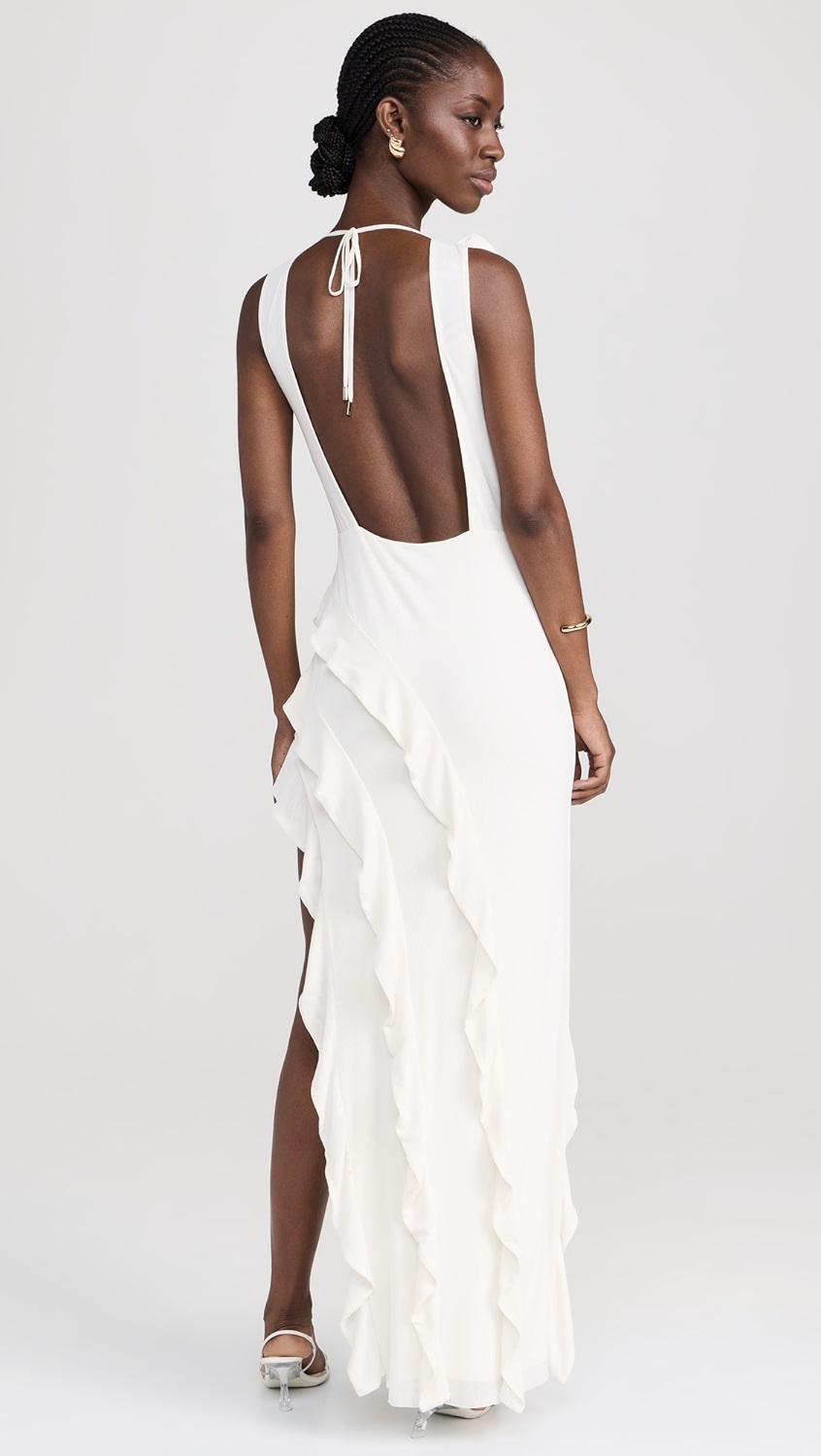 Fabric: Mid-weight stretch mesh. Scooped back. Rosette embellishment at shoulder. Thigh-high side slit. Ruffle trim. Round neckline with ties at back. Sleeveless Pullover design, no closure. Shell: 95% polyester/5% spandex Lined.