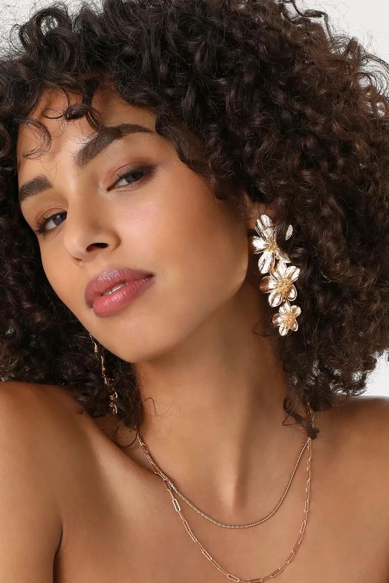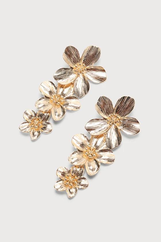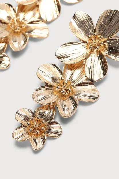 You'll ramp up the flower power every time you put on the Lulus Radiating Shine Gold Flower Statement Earrings! These statement-making earrings are shaped from gold-toned metal and have a standout presence thanks to the trio of multi-sized flowers that are arranged from largest to smallest.
