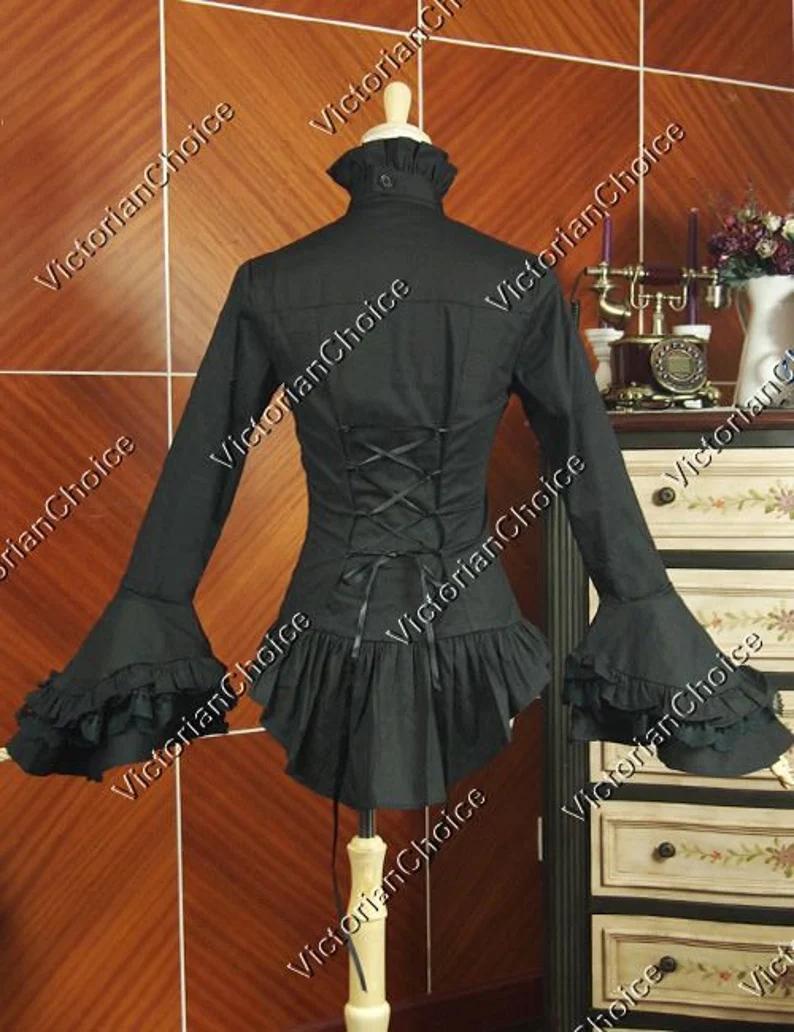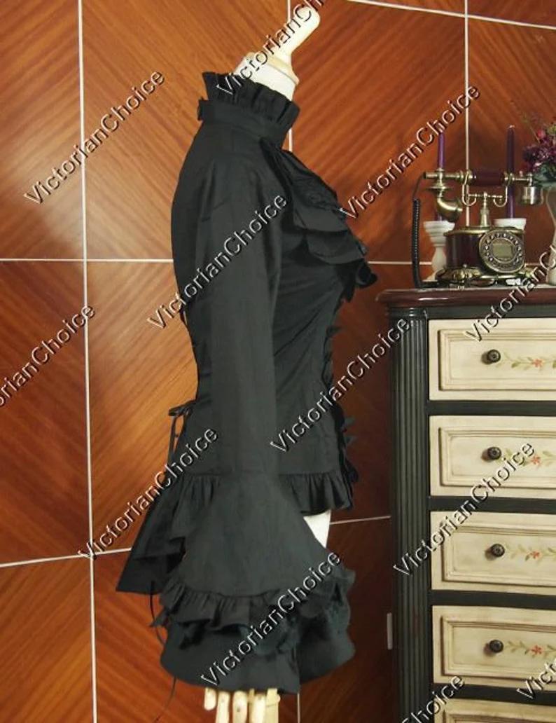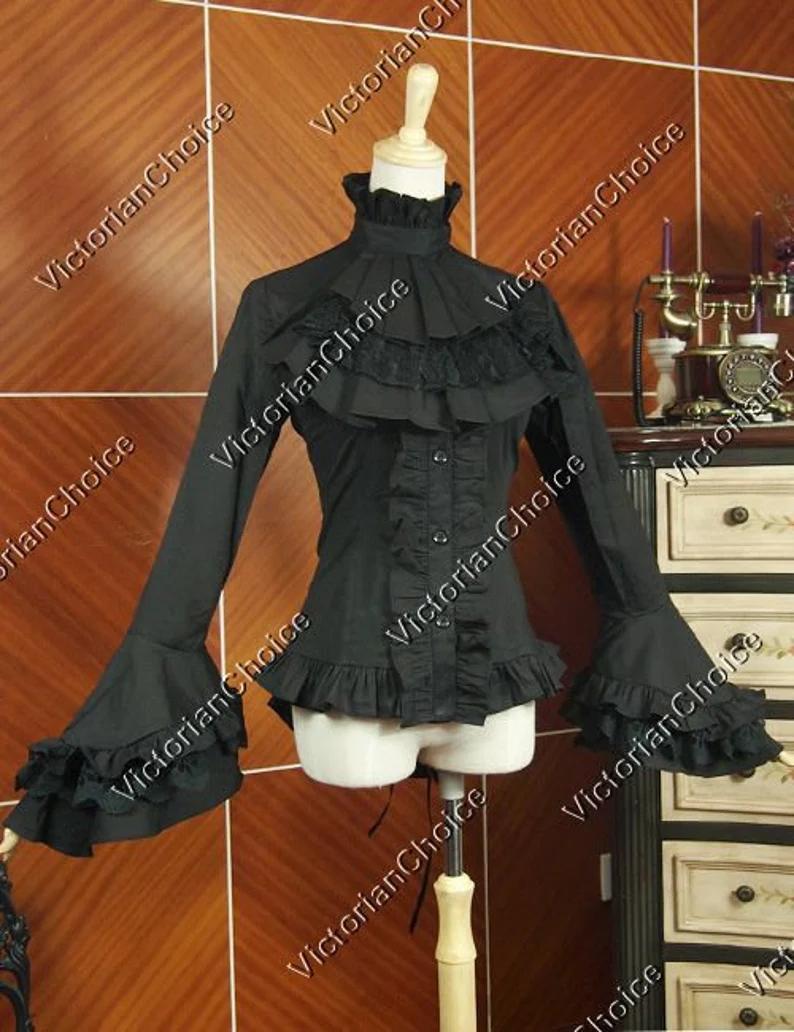 Black Victorian Gothic Women Cotton Blouse Jabot, Georgian Style Jabot Shirt, Steampunk Punk Gothic Horror Witch Shirt Top Halloween Costume