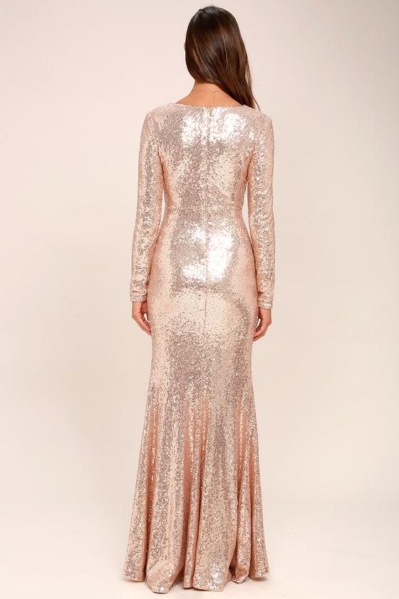 Capture the Moon Rose Gold Long Sleeve Sequin Maxi Dress