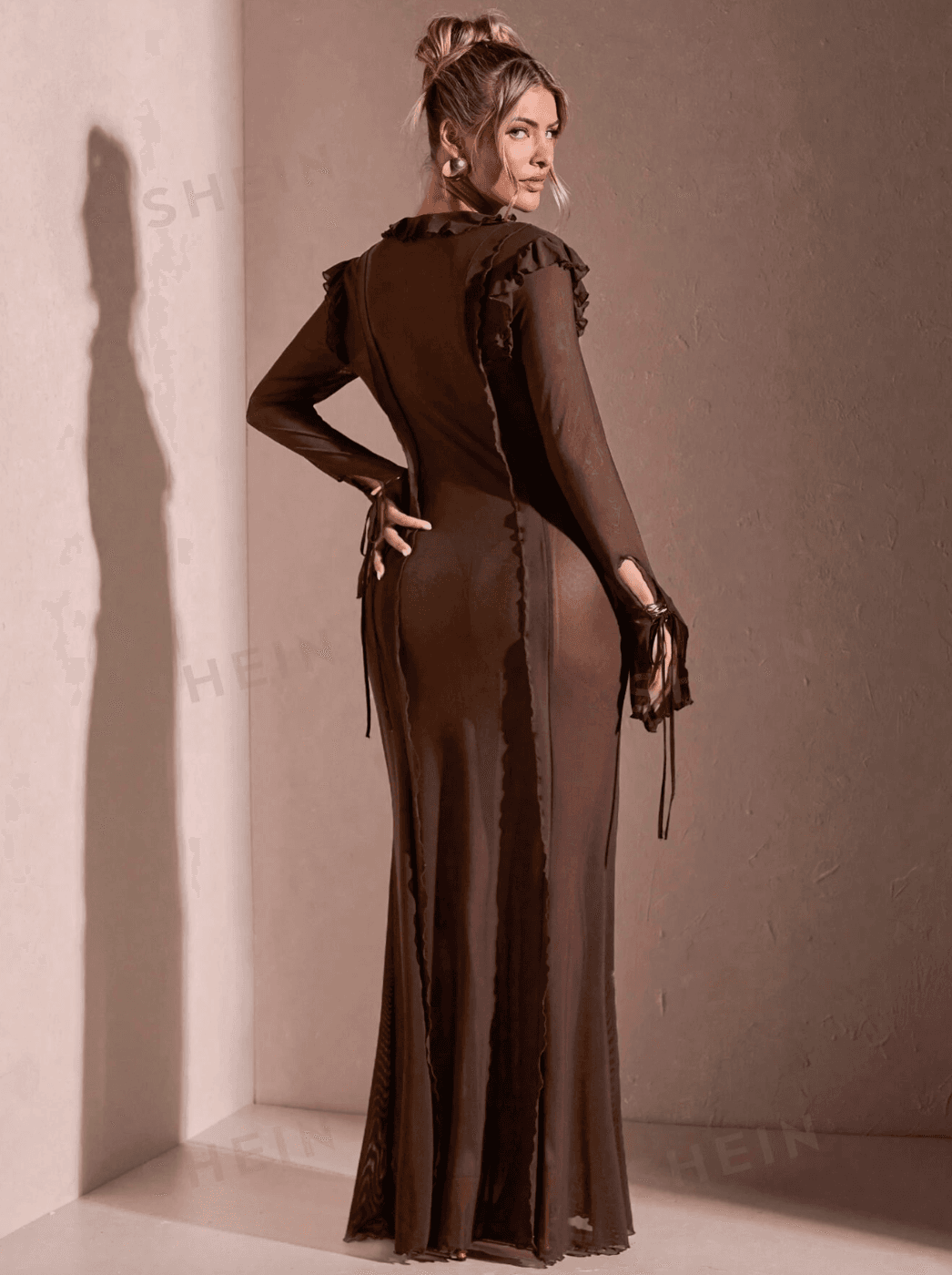 Turn up the allure in this stunning coffee-colored maxi dress. With a deep V-neckline and flounce sleeves, this ruffle-adorned dress brings a playful yet sexy vibe to any occasion. The high waist and slit hemline create a flattering A-line silhouette, while the sheer fabric adds a daring touch. Crafted from high-stretch knitted fabric (94% polyamide and 6% elastane), it offers a comfortable, slim fit